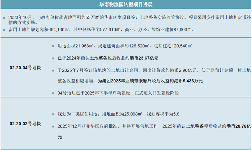 2025年12月,02号地块获深圳龙华区政府批准,标志着深国际拥有该地块的开发权,该年度确认该地块土地整备税后收益约28.78亿港元。深国际年报中称,将全力推动上述地块的开发建设,着力打造高质量示范性住宅项目,确保销售回款与现金流及时回笼。