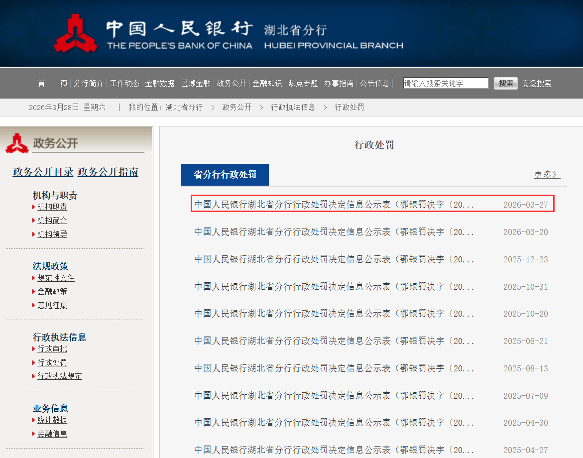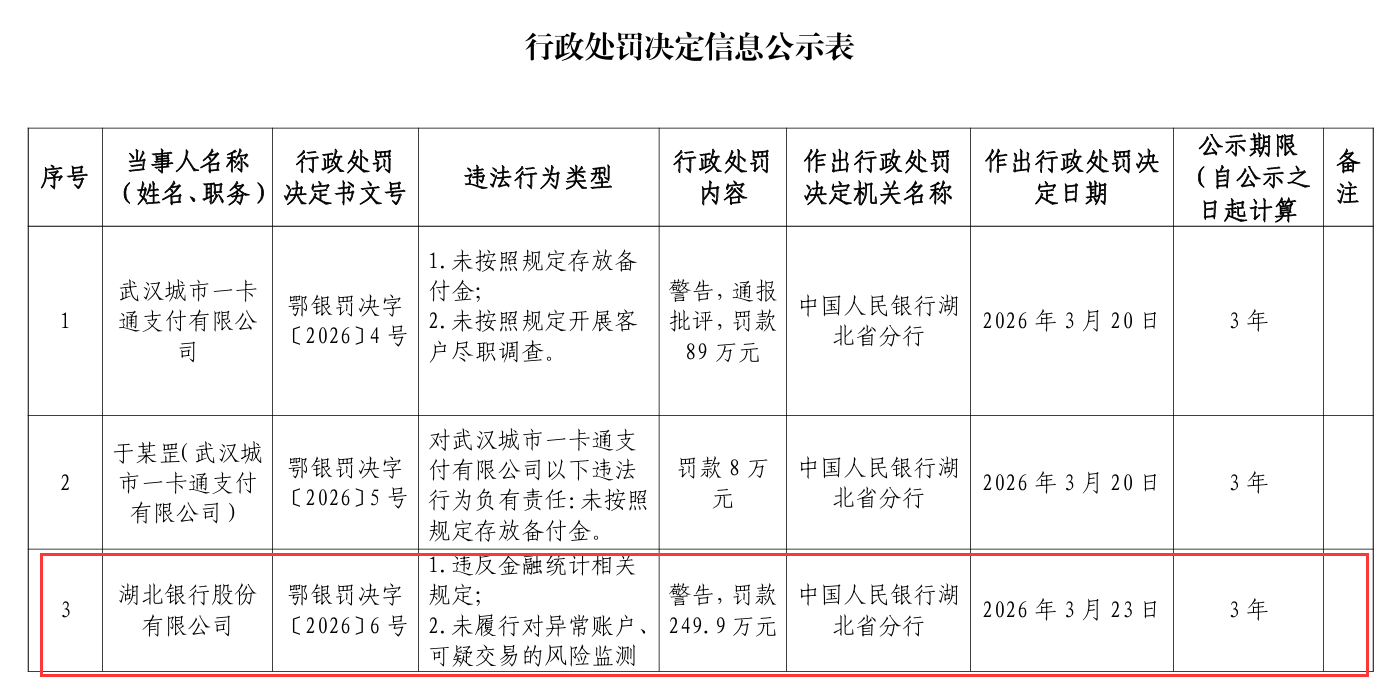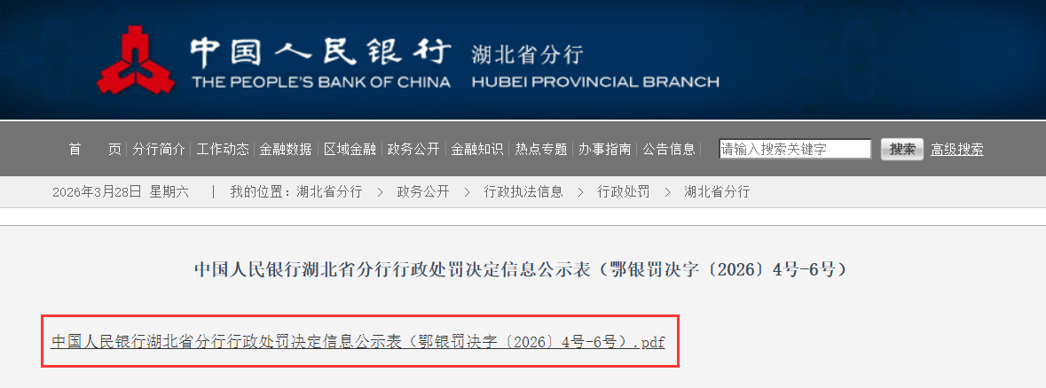 蓝鲸新闻3月27日讯,近日,中国人民银行湖北省分行发布了罚单,剑指湖北银行股份有限公司。
