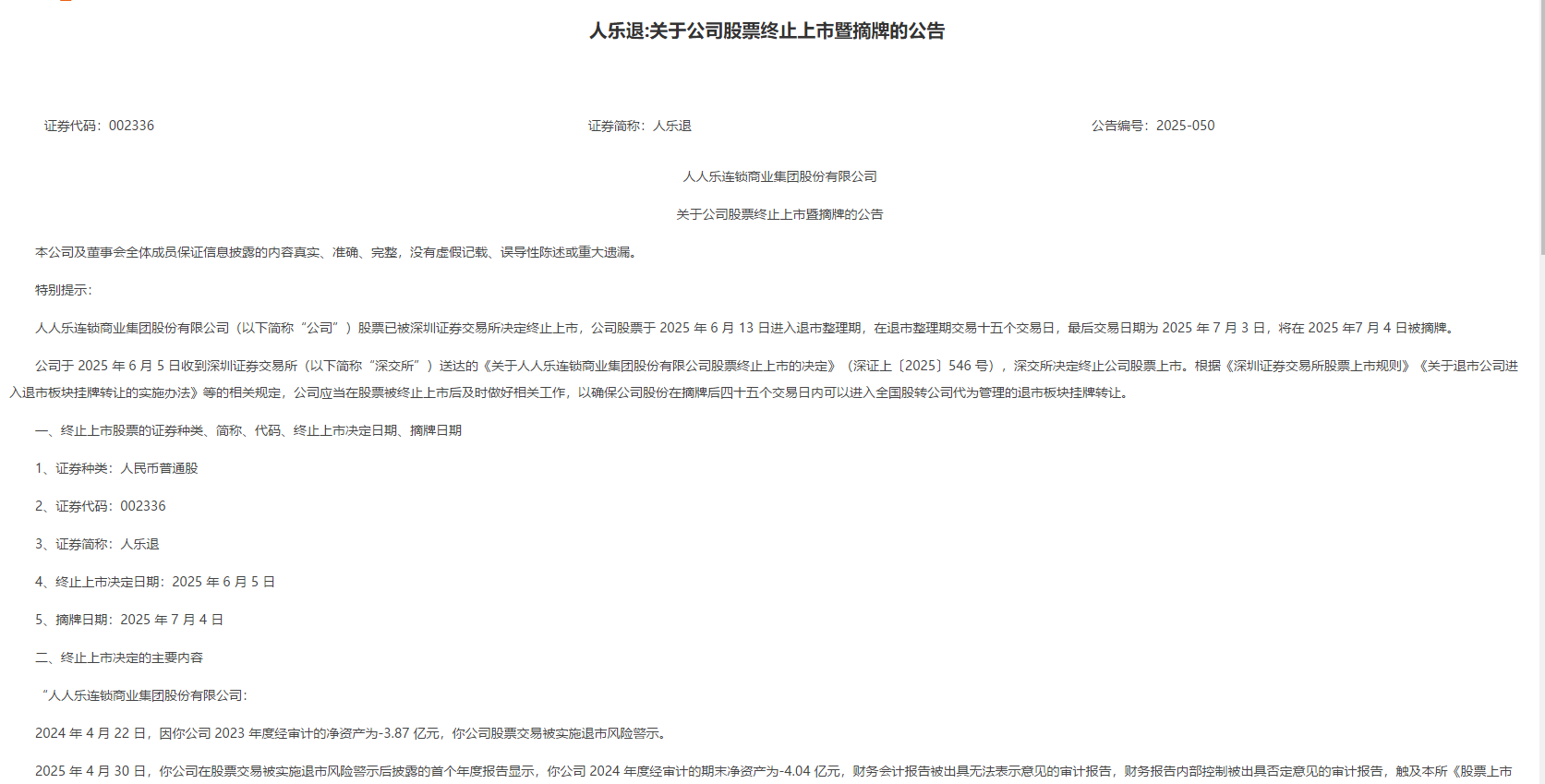 日前,根据人人乐(002336.SZ)连锁商业集团股份有限公司关于公司股票终止上市暨摘牌的公告,公司股票已被深圳证券交易所决定终止上市手机股票配资软件,于2025年7月4日被摘牌。